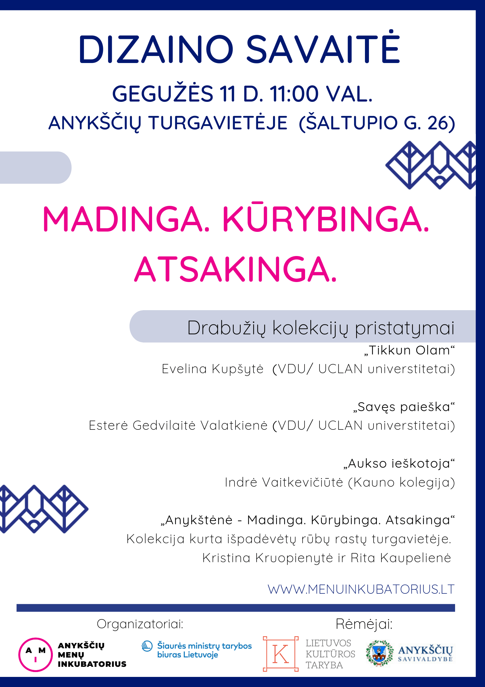 Akimirkas iš vykusių renginių galite rasti: https://www.menuinkubatorius.lt/galerija/dizaino-savaite-2019-madinga-kurybinga-atsakinga/